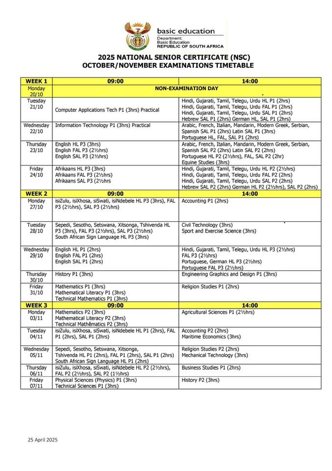 For the full official timetable, visit the Department of Basic Education’s website or contact your school directly.